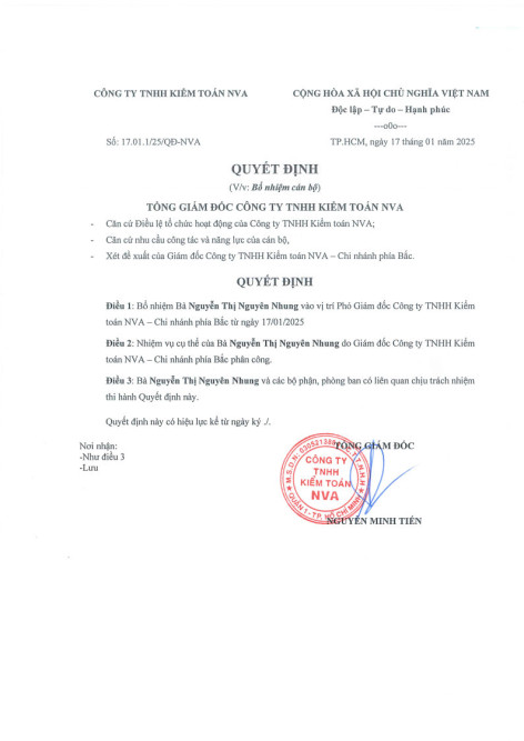 - Quyết định 02.06.1/25/QĐ-NVA bổ nhiệm Phó giám đốc Công ty TNHH Kiểm toán NVA - Chi nhánh phía Bắc